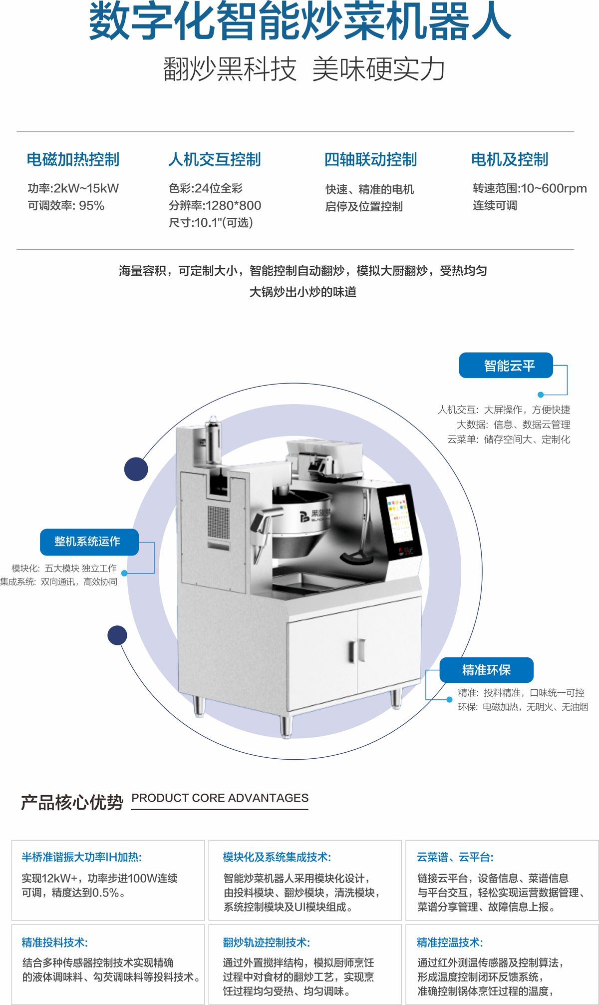 數(shù)字化智能炒菜鍋則根據(jù)指令按菜品工藝執(zhí)行炒制、按配方進(jìn)行調(diào)味,機(jī)器手執(zhí)行抓取凈菜/調(diào)理肉/調(diào)料等動(dòng)作,各模塊協(xié)同運(yùn)作,全面保障烹飪、調(diào)料、出餐持續(xù)穩(wěn)定流暢進(jìn)行。同時(shí),小炒系統(tǒng)配置自動(dòng)清洗功能,菜品炒制結(jié)束任務(wù)結(jié)束后,自動(dòng)進(jìn)行清洗。